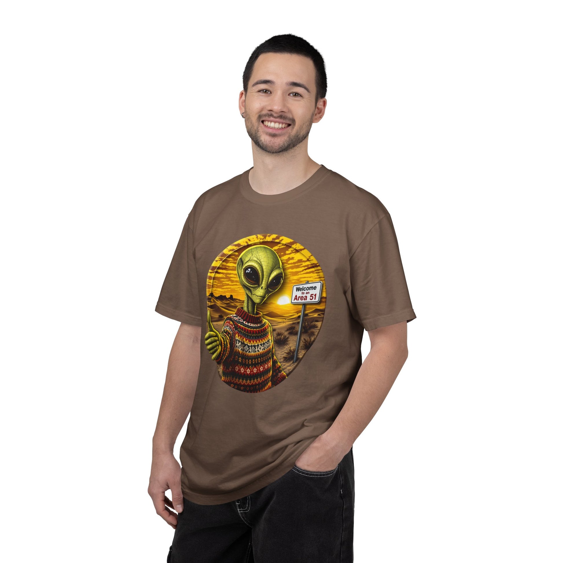 This Area 51 alien with ugly sweater themed Unisex T-shirt gives off a fun and quirky vibe, perfect for alien enthusiasts and fans of unique designs. It is a great addition to your casual wardrobe and can be worn on quirky holidays like World UFO Day. Product features - Available in multiple sizes from S to 4XL - Double-needle stitching for durability - Knit without side seams for a clean look - Soft and textured garment-dyed fabric - Made of 100% ring-spun US cotton