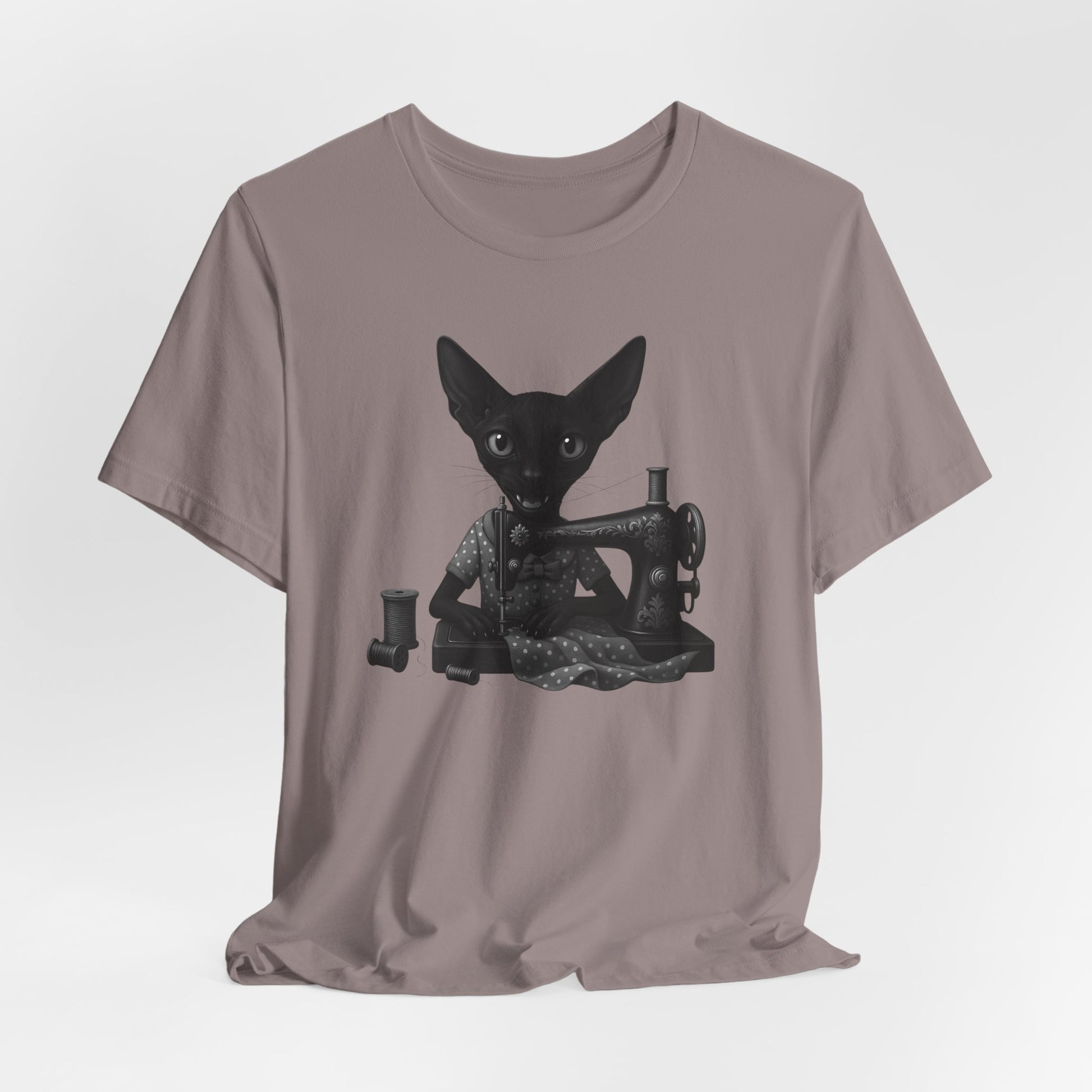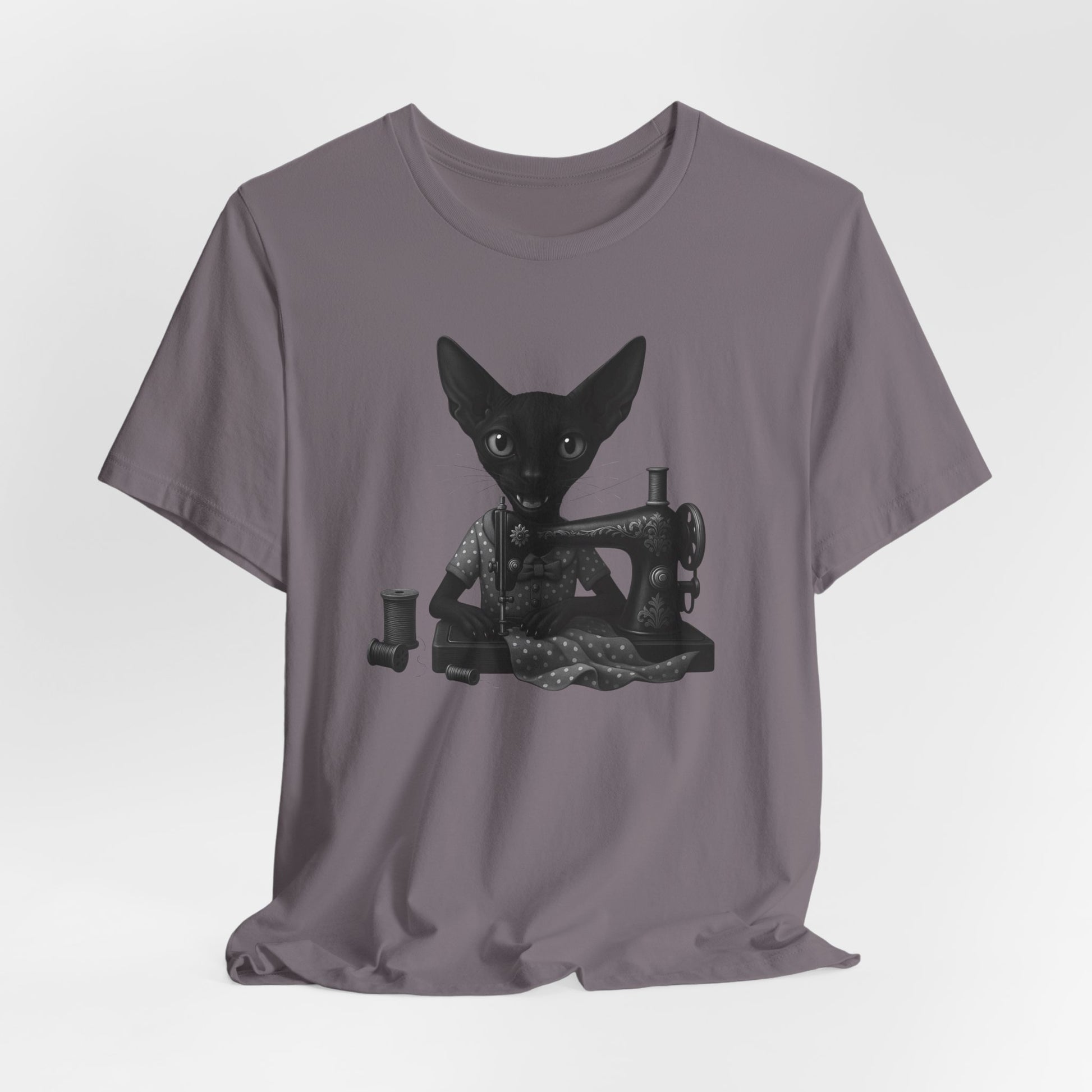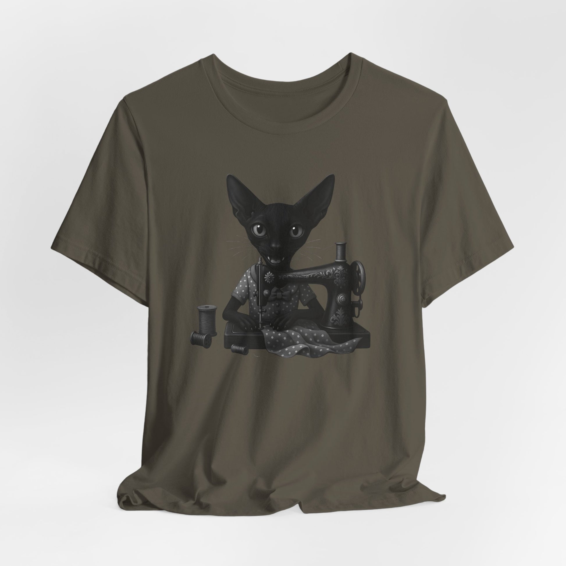 This Unisex Jersey Short Sleeve Tee features a black cat happily sewing on a craft machine. The casual yet quirky design adds a fun touch to any outfit, making it perfect for cat lovers and craft enthusiasts. Ideal for everyday wear, lounging at home, or as a unique gift for birthdays, holidays, or crafting occasions. Product features - Breathable 100% Airlume combed and ring-spun cotton fabric - Retail fit for casual and semi-formal settings - Direct-to-Garment printing for crisp sleeve and label designs - Ethically made in the US and internationally with sustainable practices - Tear-away label for added comfort