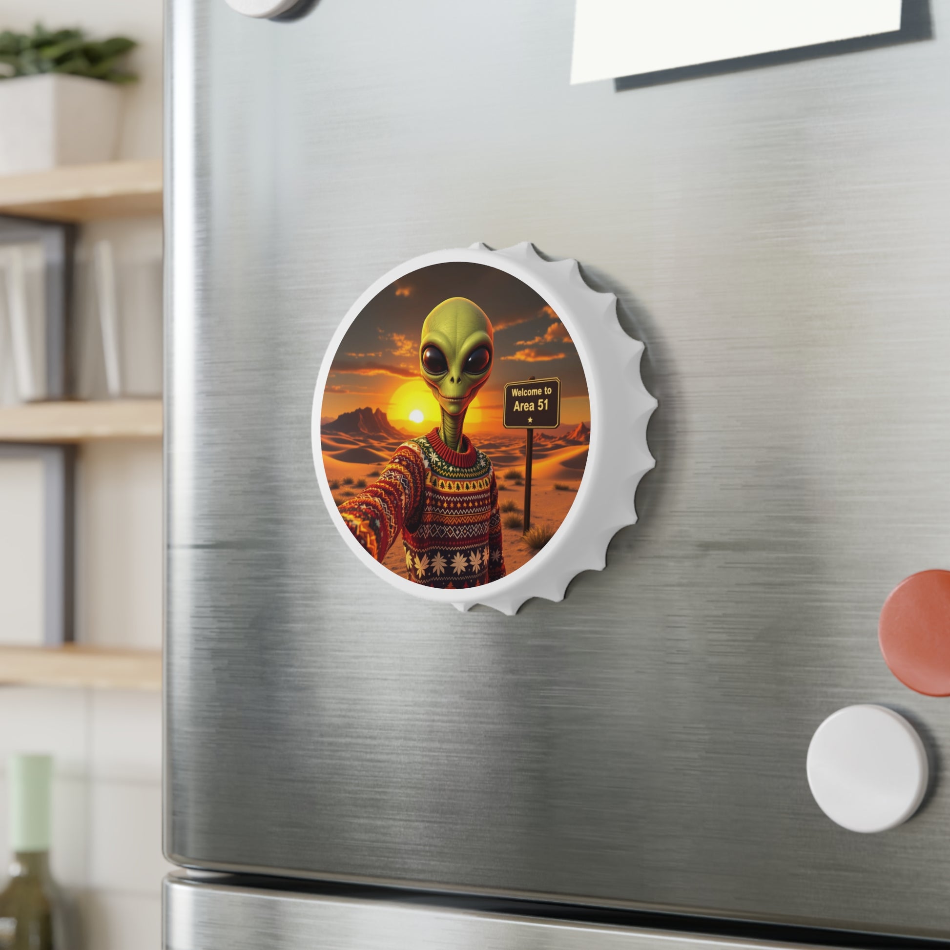 Add some fun to your kitchen or bar with this Bottle Opener alien magnet, perfect for taking selfies with your Christmas ugly sweater. This unique and functional item is a great conversation starter and makes a great gift for adults who enjoy a quirky touch to their home decor. Perfect for Christmas and holiday gatherings.