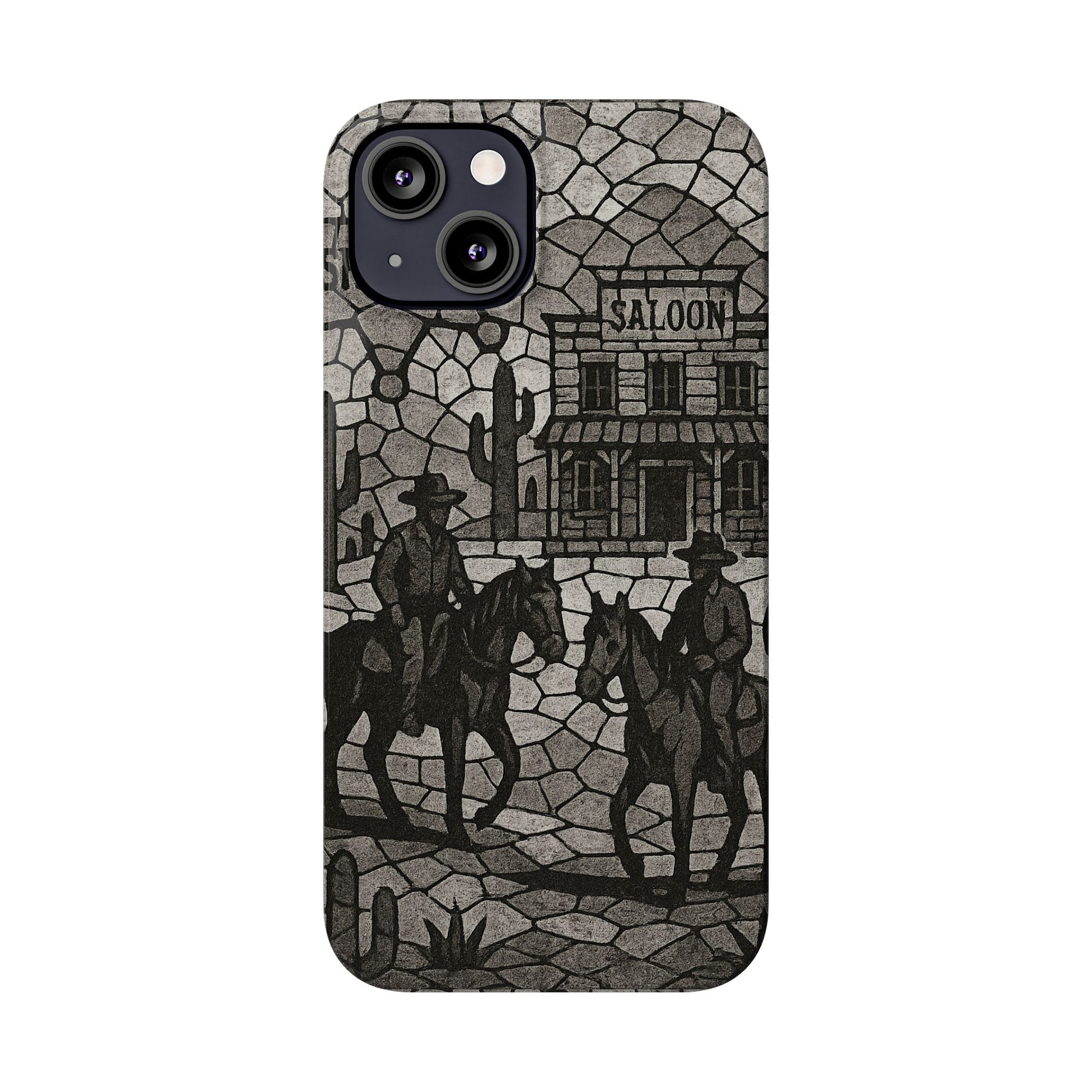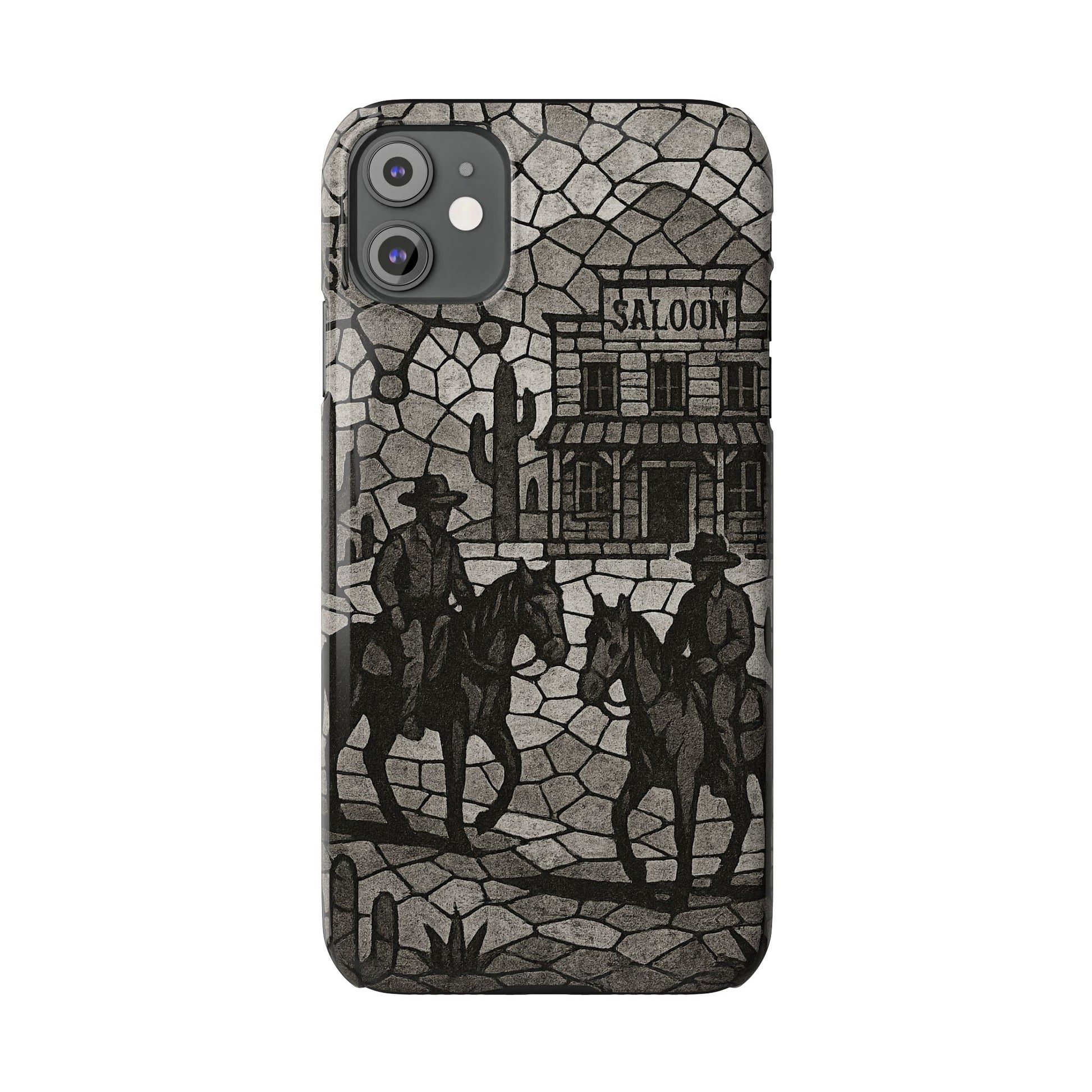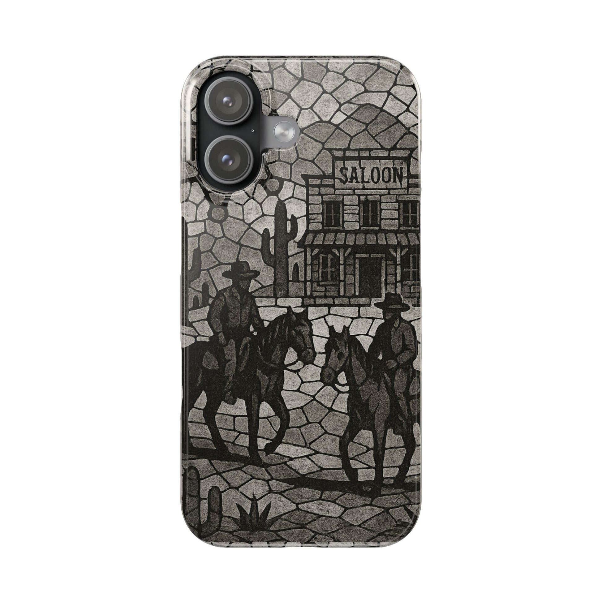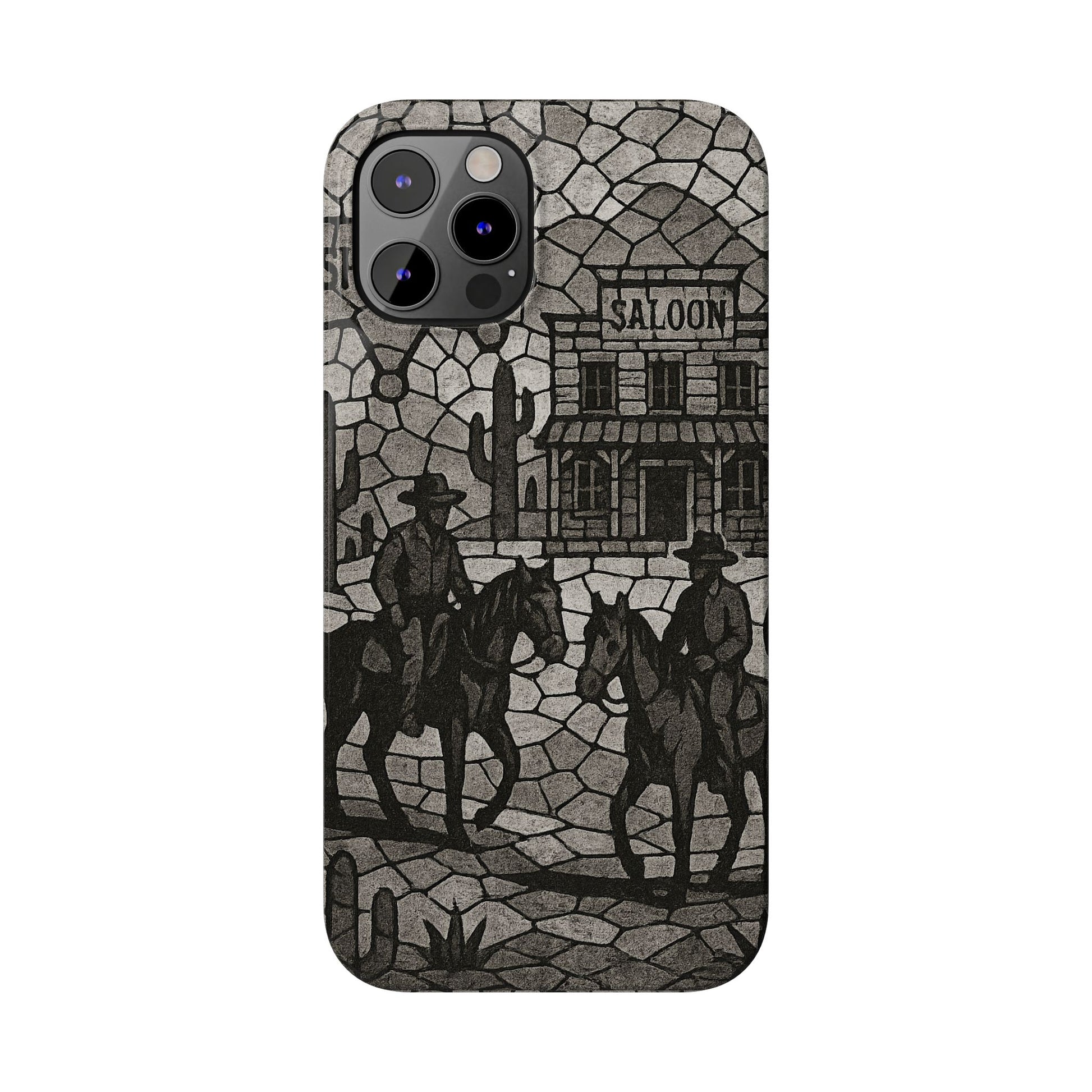 Slim Phone Cases Vintage Wild West Mosaic Art | Black & White Cowboy Scene | Sheriff, Horses & Saloon