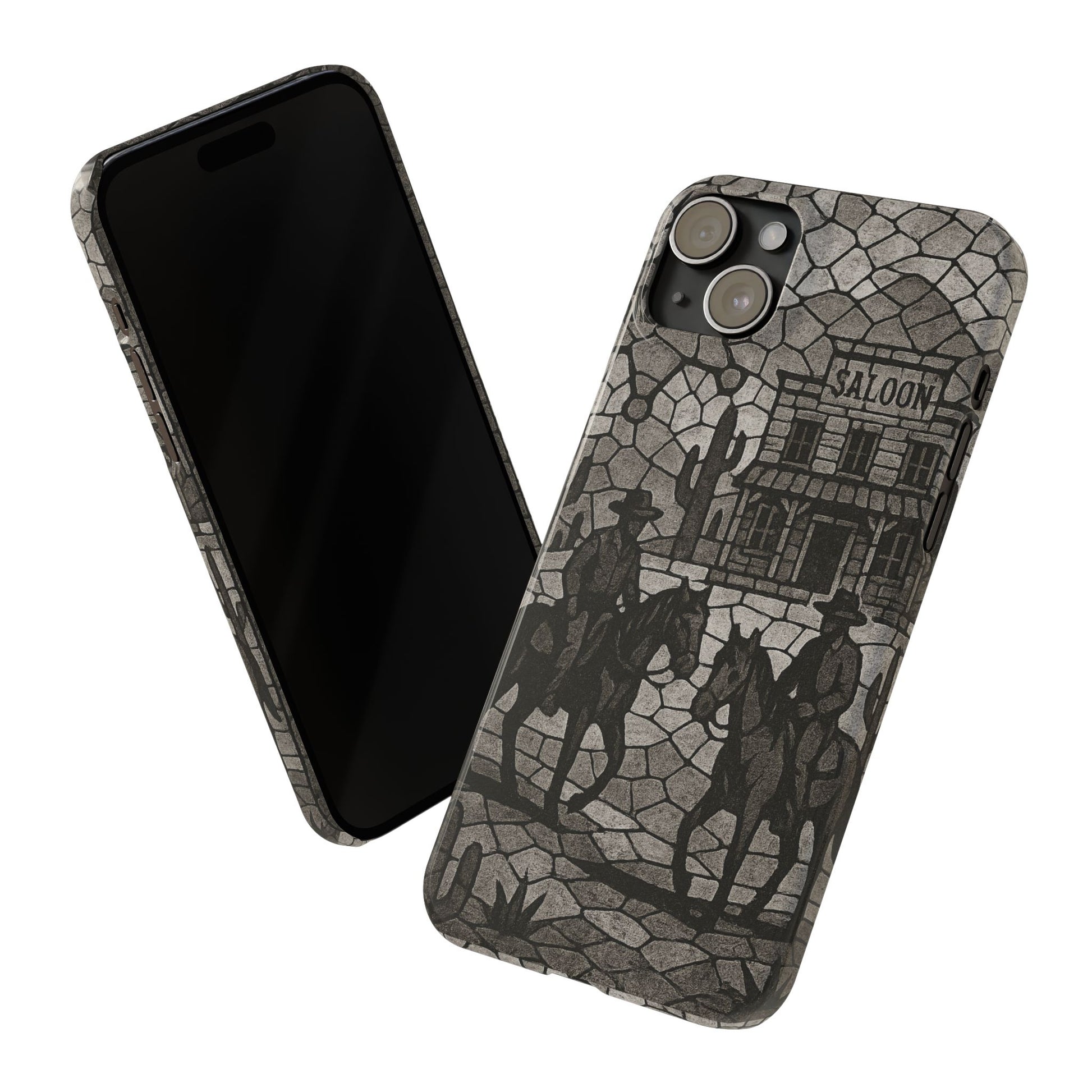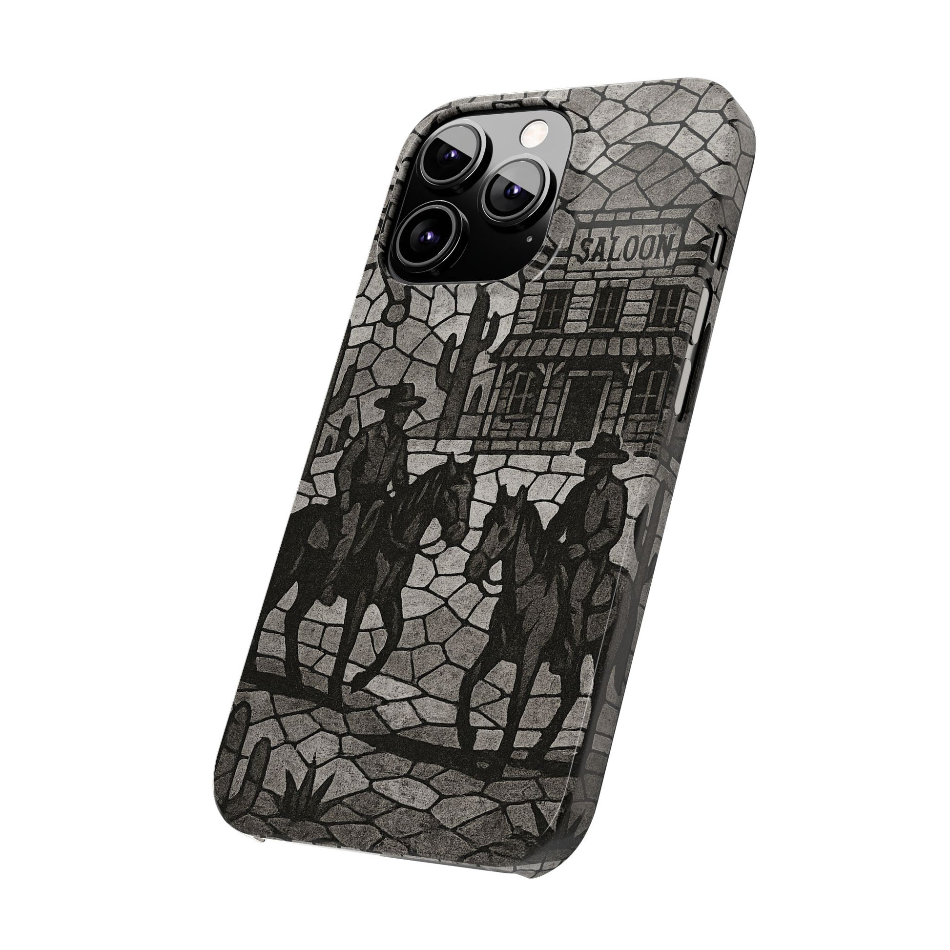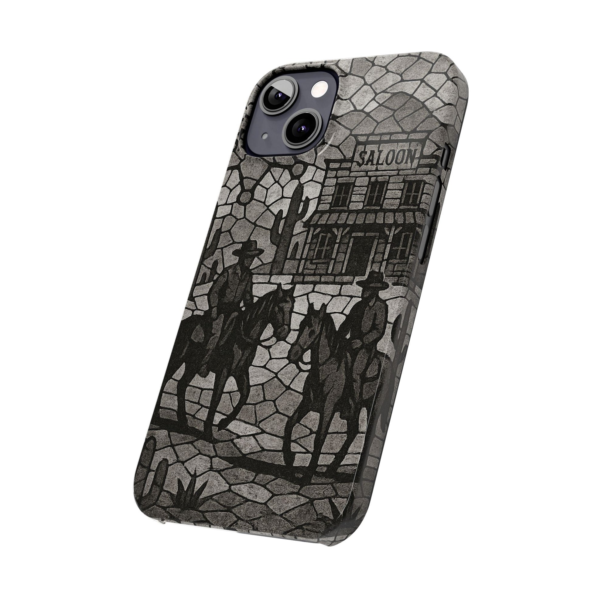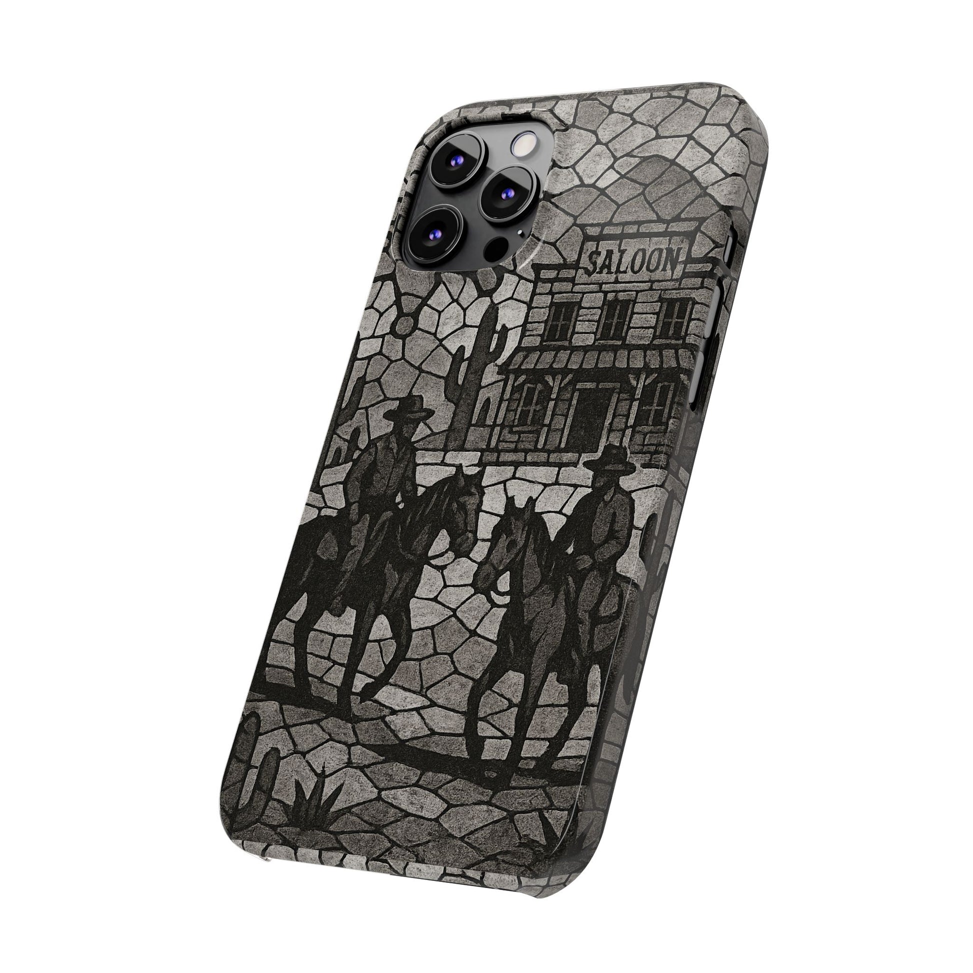 Slim Phone Cases Vintage Wild West Mosaic Art | Black & White Cowboy Scene | Sheriff, Horses & Saloon