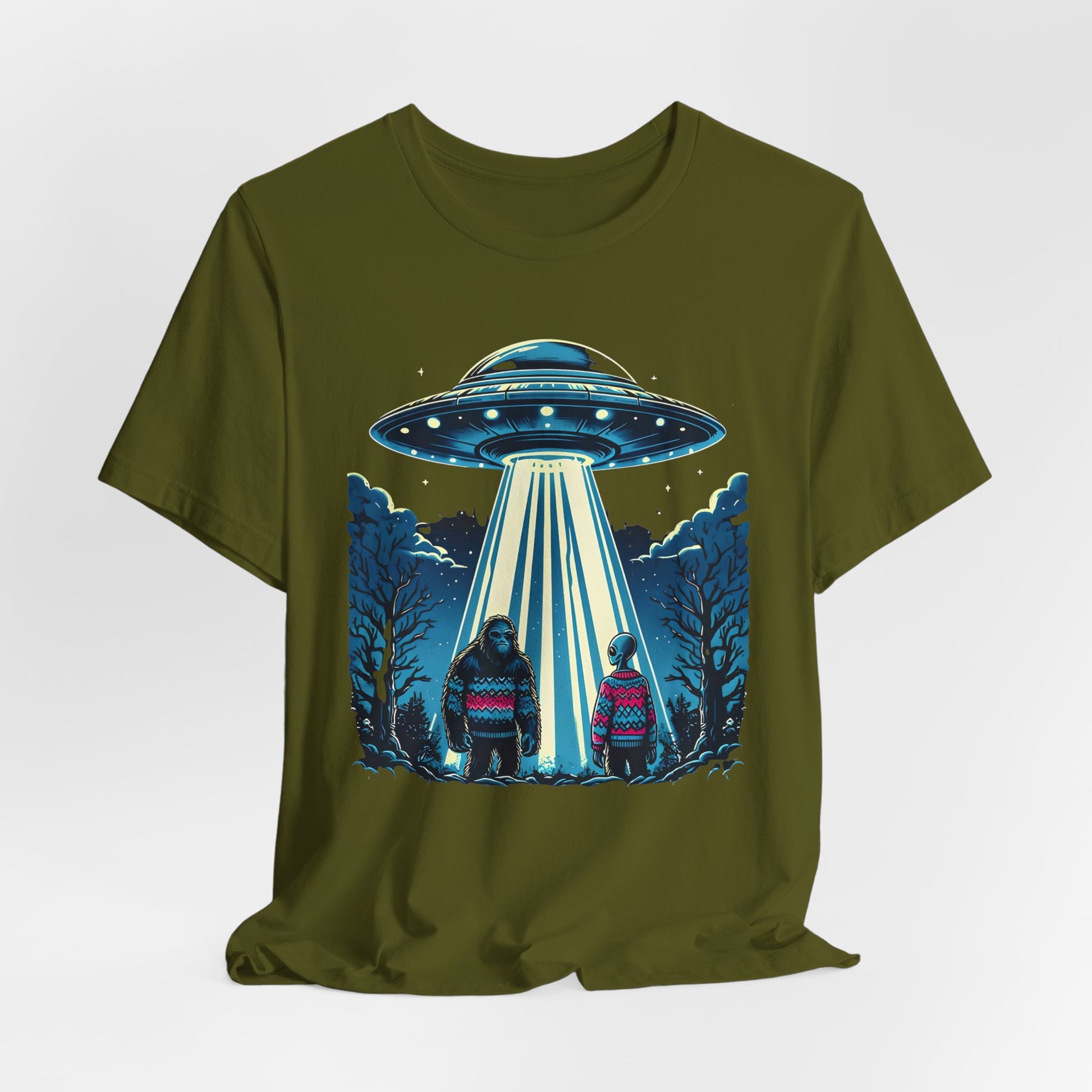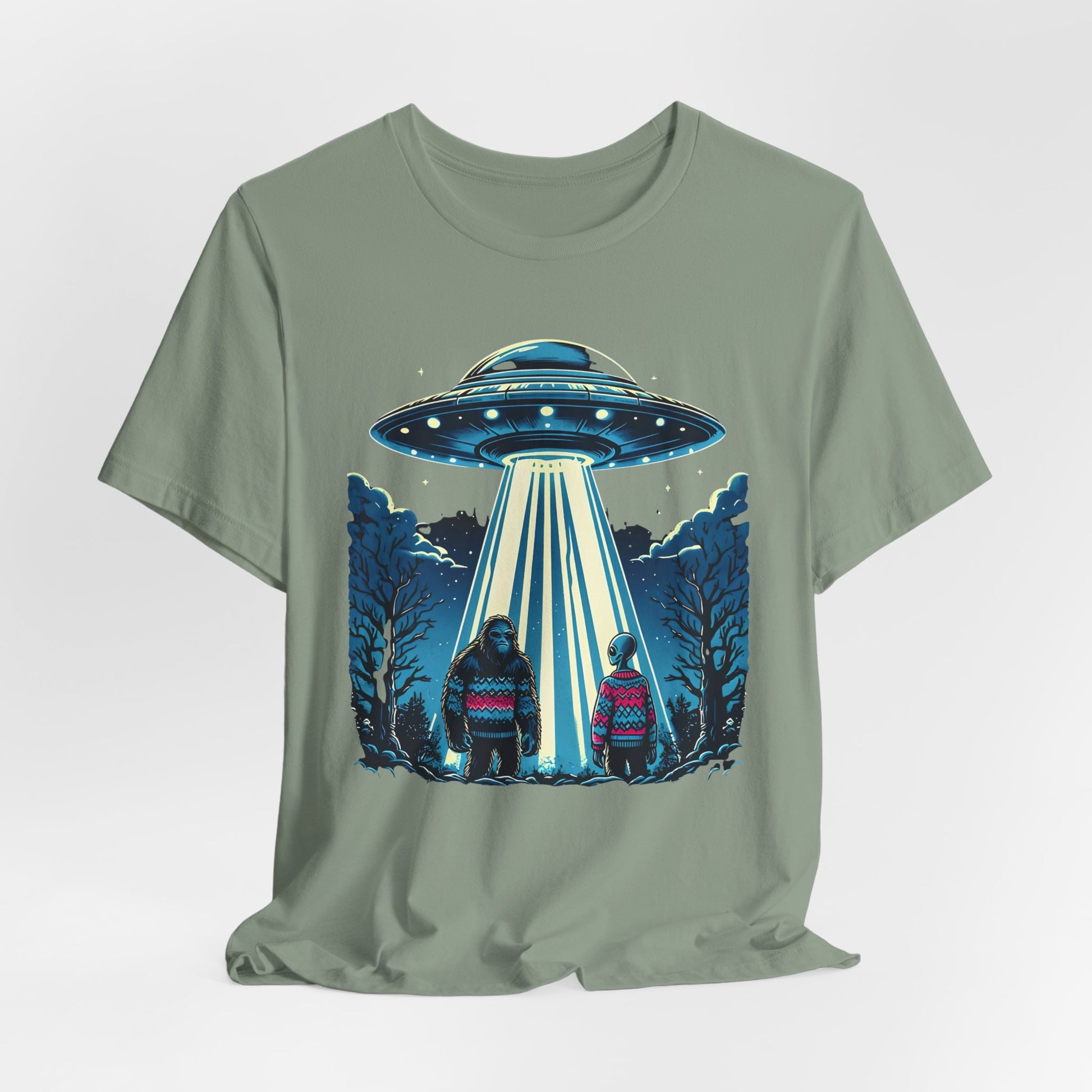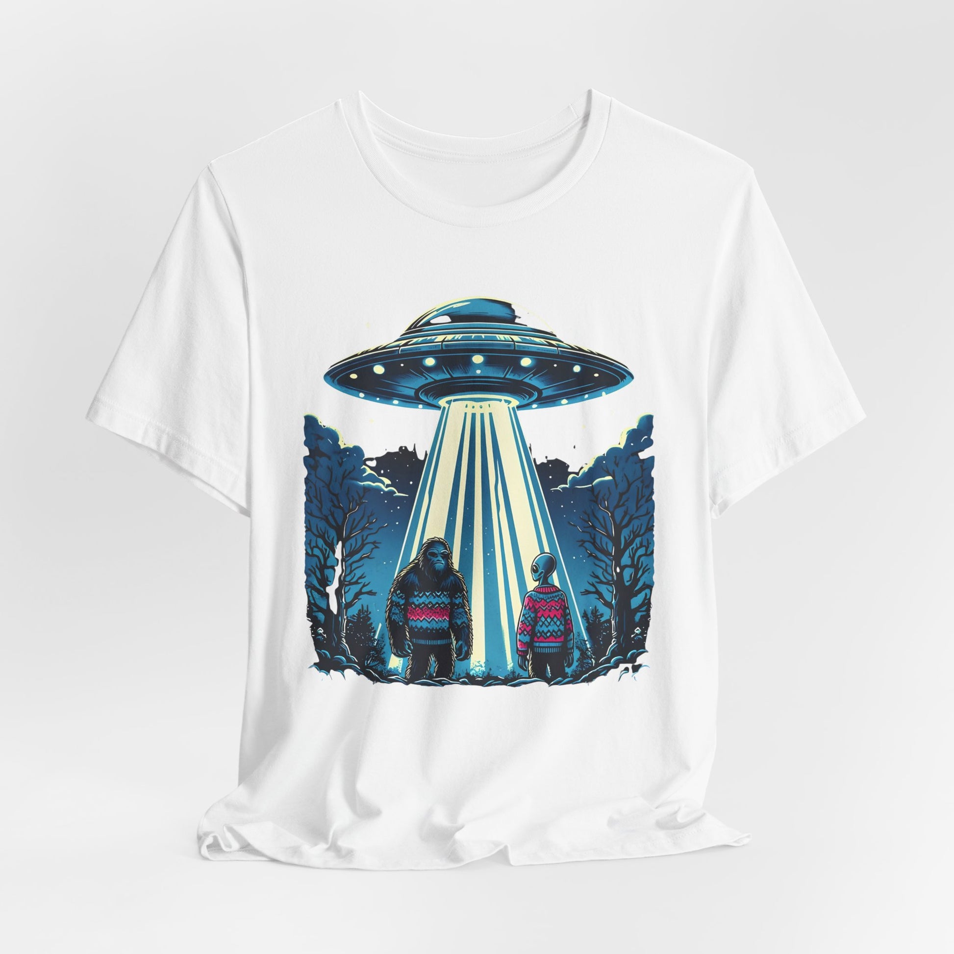 T-Shirt Alien and Bigfoot, Ugly Christmas Sweater Tee, Funny UFO Holiday Shirt
