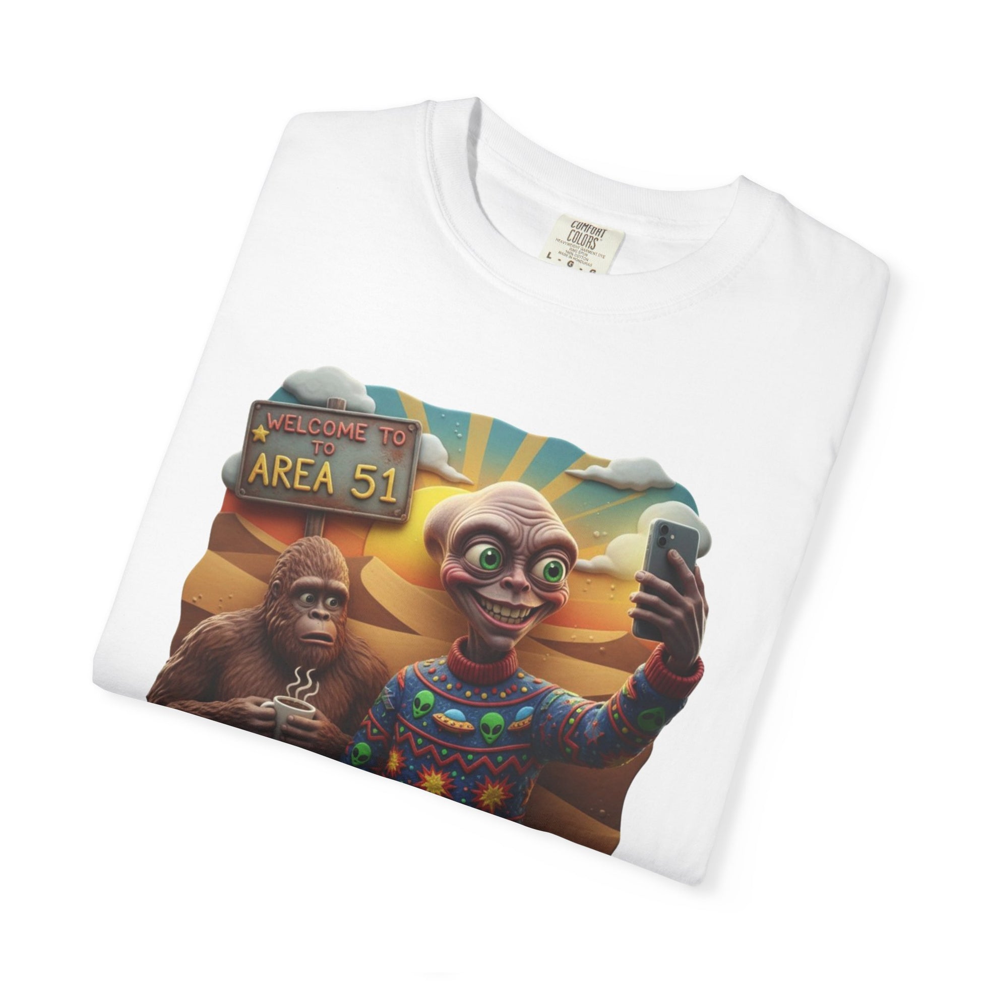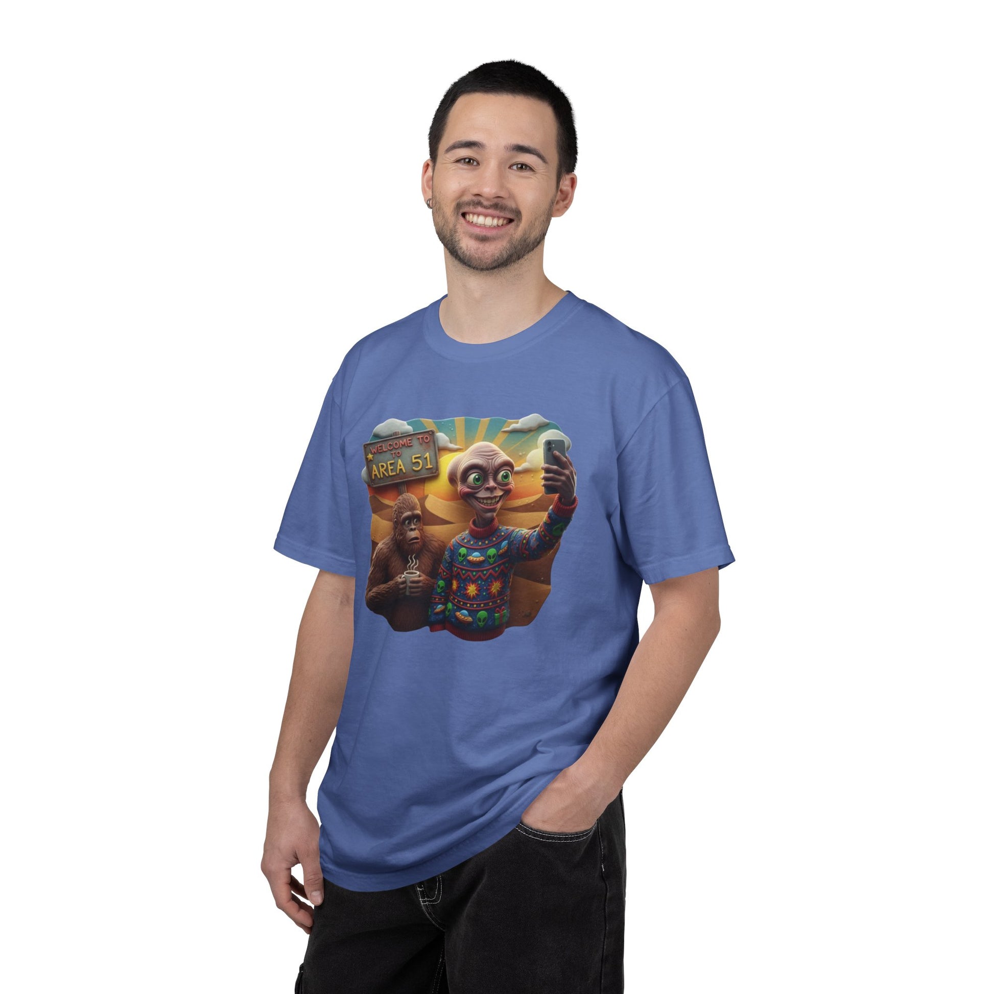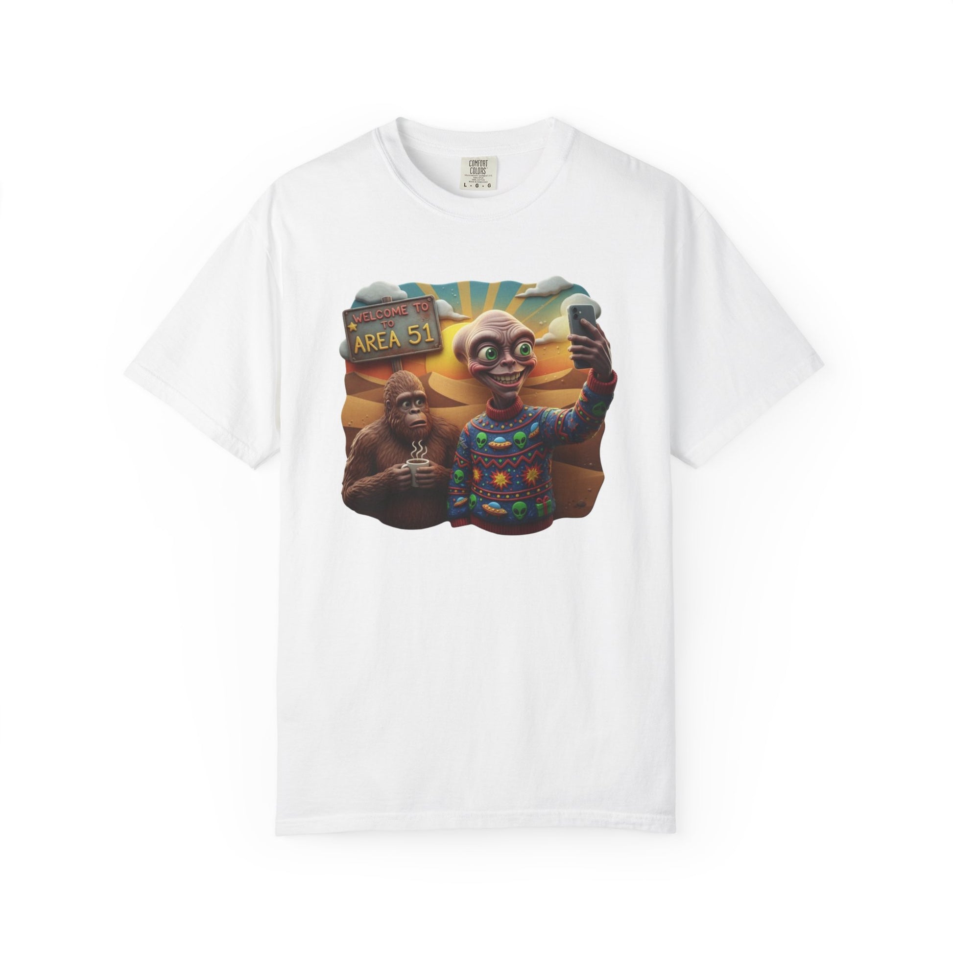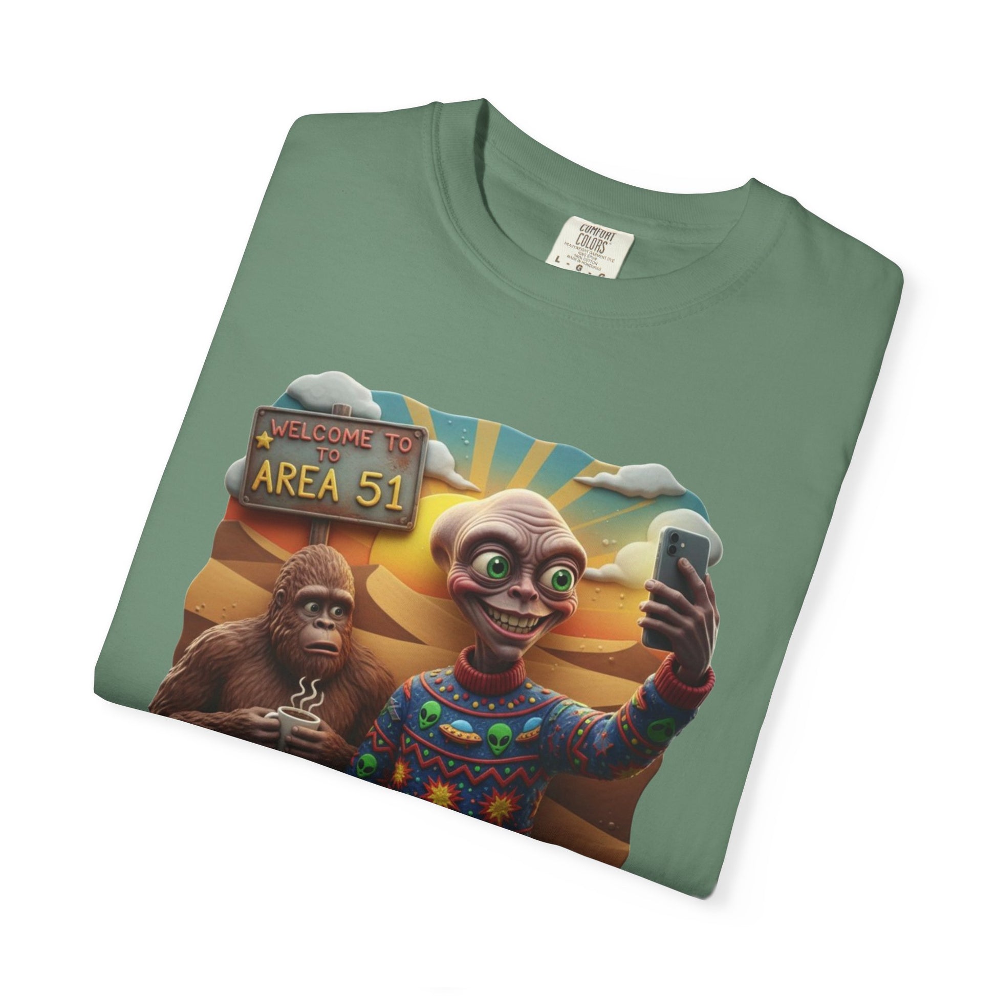 This Are 51 alien and big foot take self and alien were ugly sweater T-shirt gives a fun and quirky vibe, perfect for those who love conspiracy theories and the unknown. It is great for casual wear or as a statement piece at themed parties. Relevant for Halloween, UFO Day, and Cryptid Conservation Day enthusiasts. Product features - Available in multiple sizes from S to 4XL - Double-needle stitching for durability - Garment-dyed fabric for soft color and texture - Made of 100% ring-spun US cotton for comfort - Knit without side seams for a more attractive look