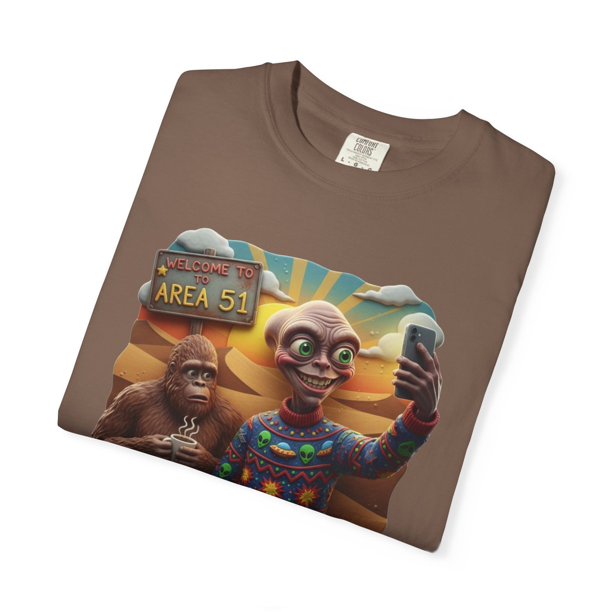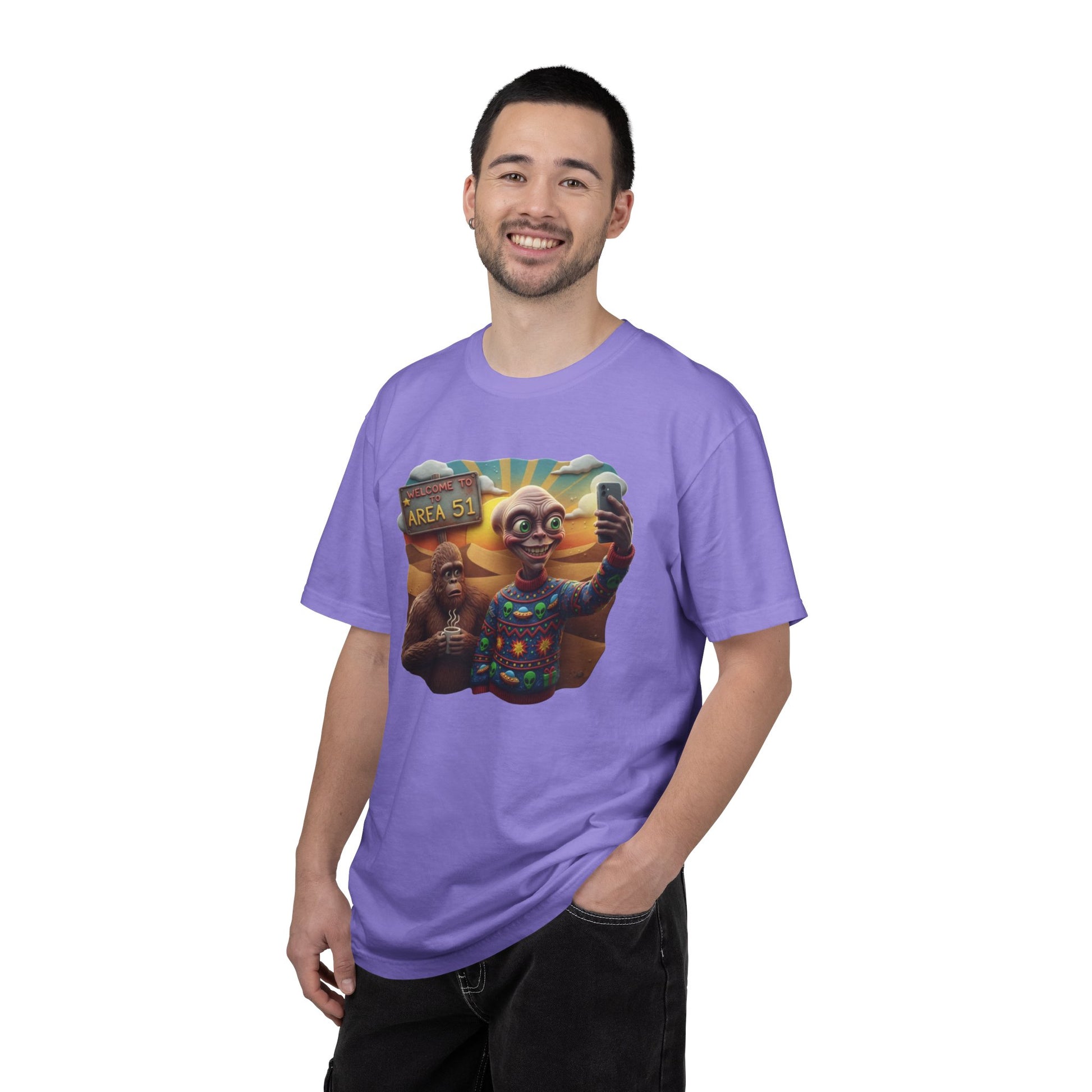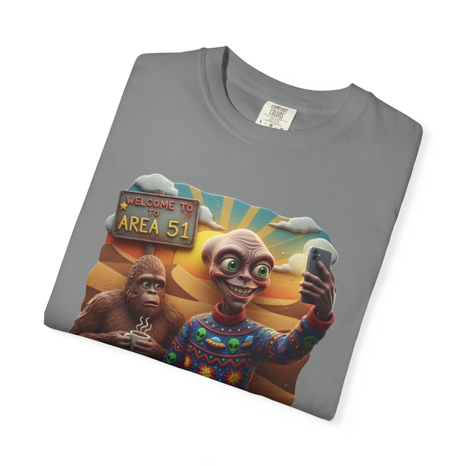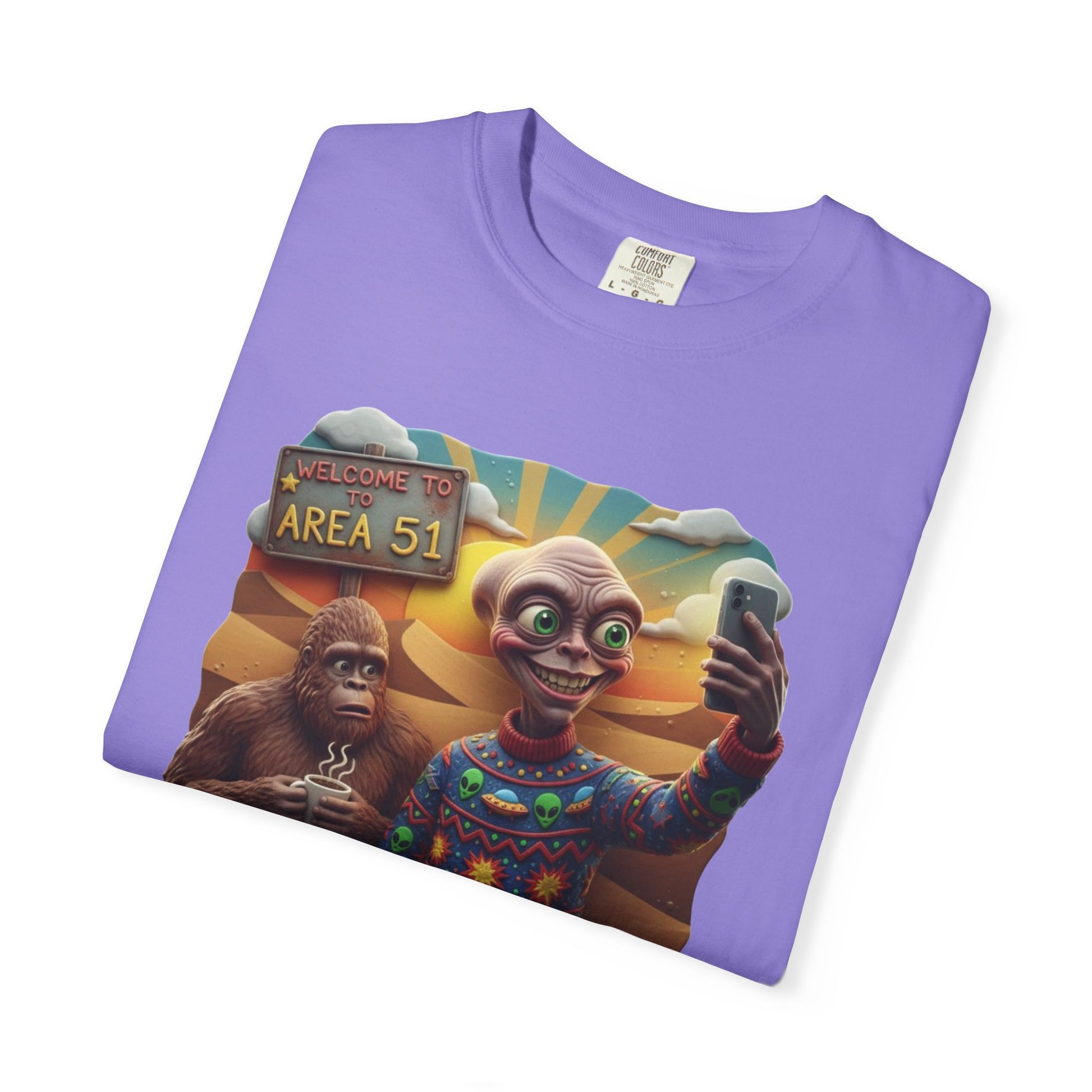 This Are 51 alien and big foot take self and alien were ugly sweater T-shirt gives a fun and quirky vibe, perfect for those who love conspiracy theories and the unknown. It is great for casual wear or as a statement piece at themed parties. Relevant for Halloween, UFO Day, and Cryptid Conservation Day enthusiasts. Product features - Available in multiple sizes from S to 4XL - Double-needle stitching for durability - Garment-dyed fabric for soft color and texture - Made of 100% ring-spun US cotton for comfort - Knit without side seams for a more attractive look
