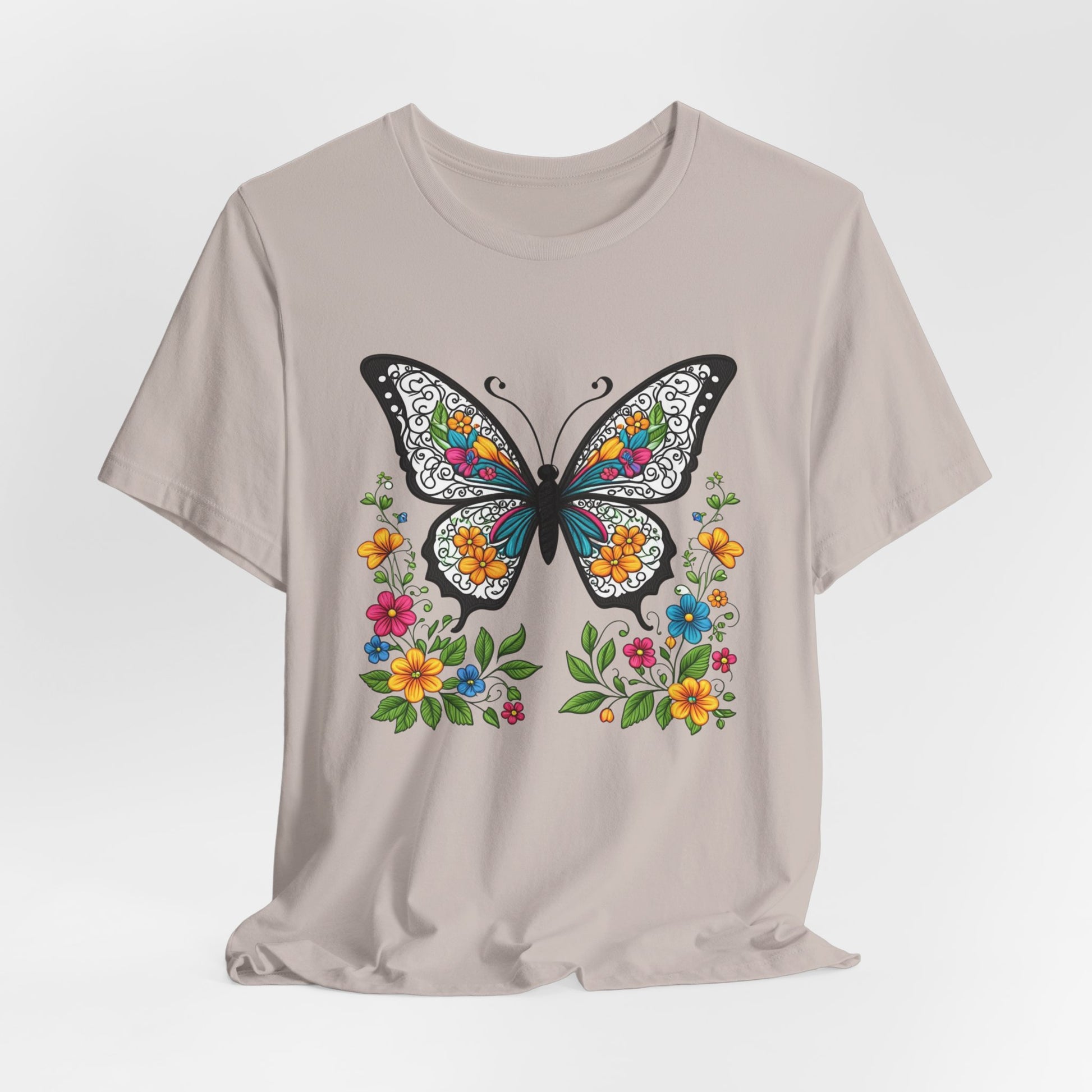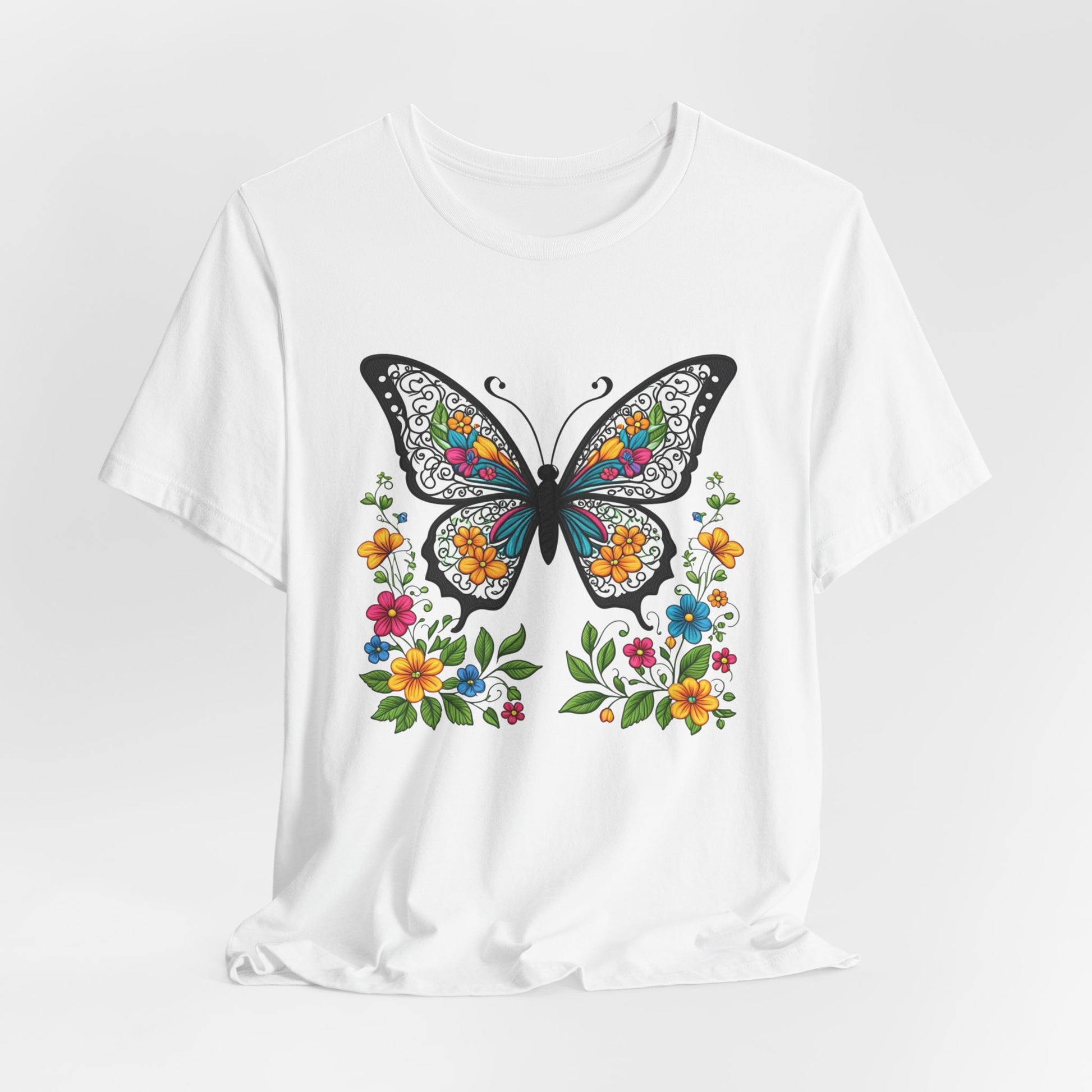 A comfortable and versatile Unisex Jersey Short Sleeve Tee featuring a design of butterflies and flowers. This tee exudes a vibrant and joyful vibe, perfect for casual wear or layering. Ideal for adults looking for a lightweight, breathable fabric that is easy to style. Suitable for holidays, outdoor gatherings, and everyday wear. Product features - Made with 100% Airlume combed and ring-spun cotton - Retail fit perfect for casual and semi-formal settings - Shoulder tape for structural support - Direct-to-Garment printing for vibrant sleeve and neck label designs - Tear-away label for minimizing skin irritation