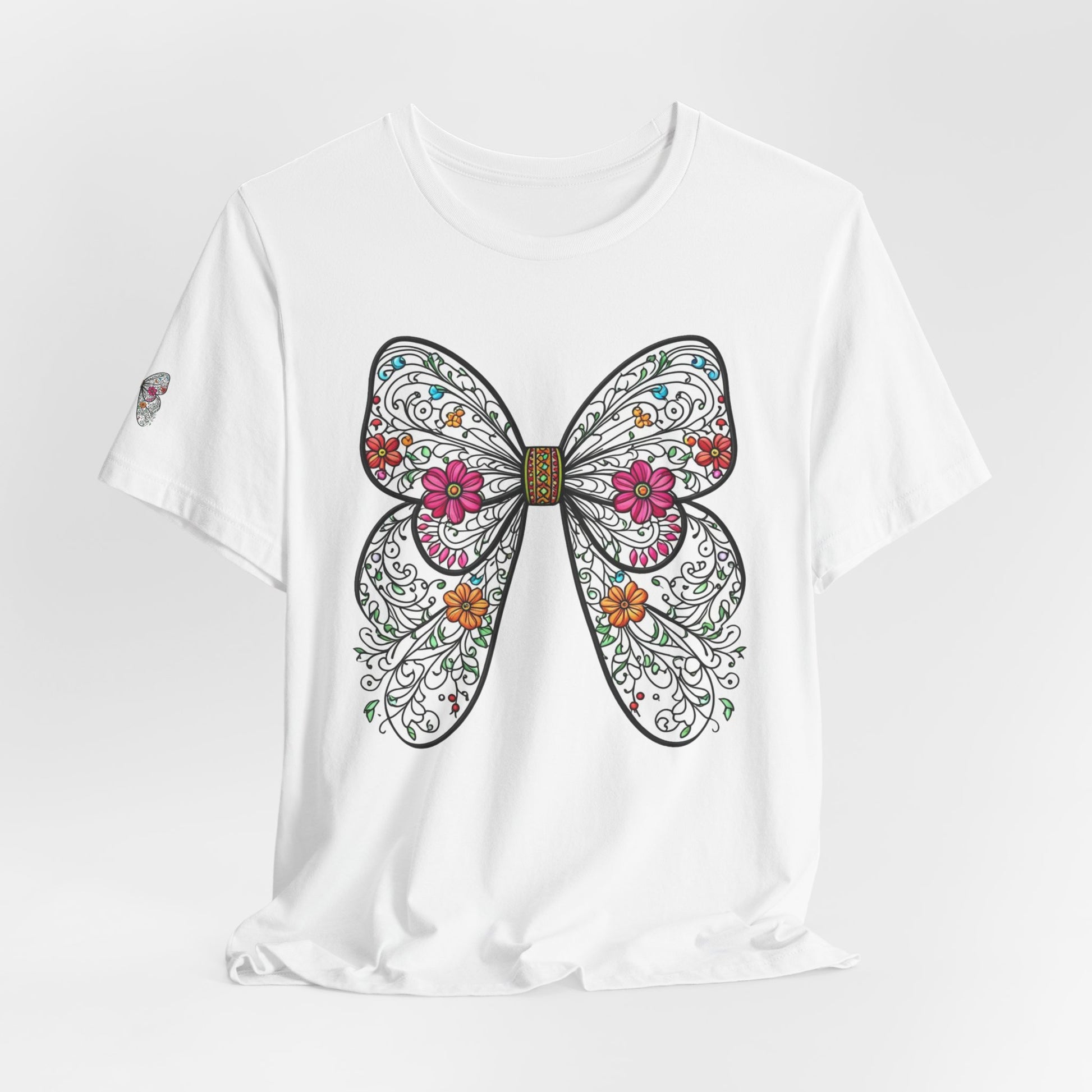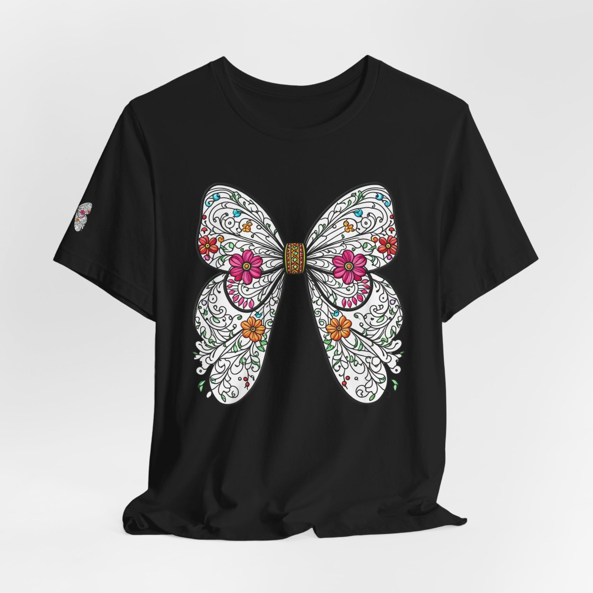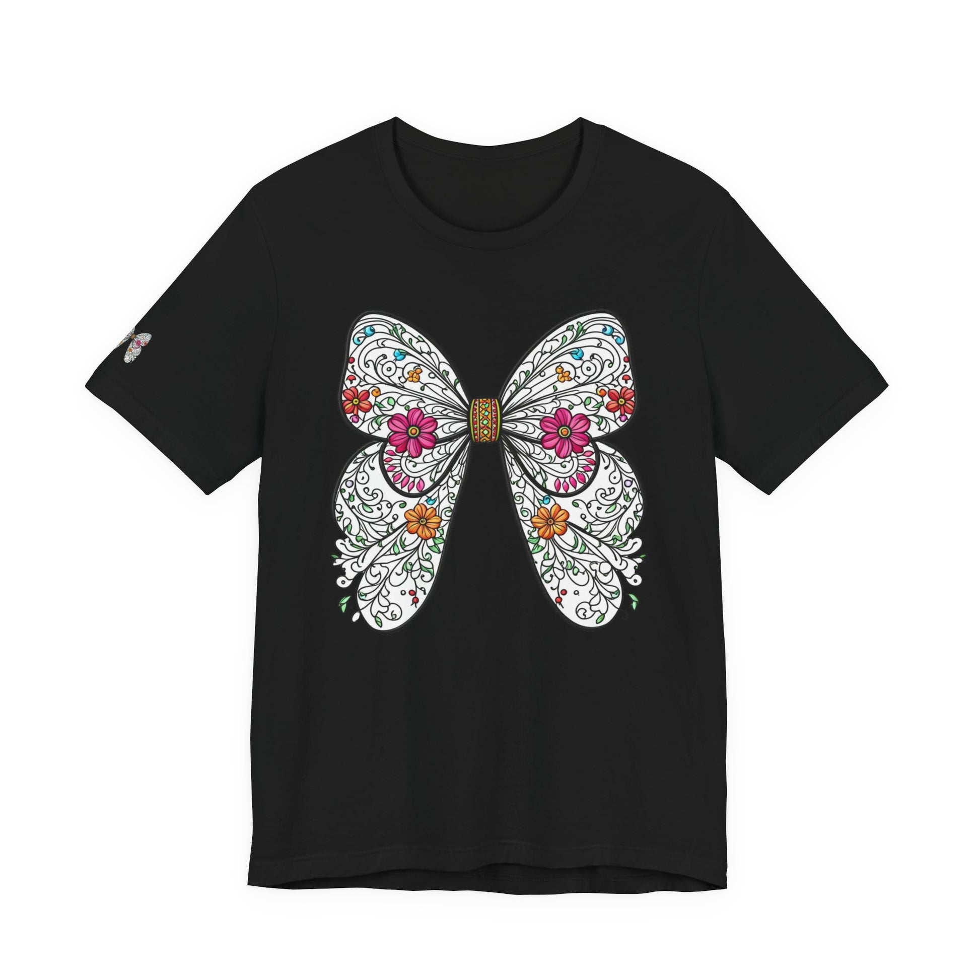 A casual and comfortable Unisex Jersey Short Sleeve Tee with a butterfly design on the front and right sleeve. Perfect for adding a touch of whimsy to any outfit. Ideal for those who love nature and feminine aesthetics. Great for everyday wear, casual outings, and nature-themed events. Product features - With side seams for structural support - Ribbed knit collar with seam for shape retention - Shoulder tape for stability - Sleeve Printing Techniques ensure crisp designs - Made with 100% lightweight Airlume combed and ring-spun cotton